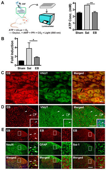 We then tested the expression of VNUT in relation to EB. VNUT has been identified in a number of different cell types including biliary epithelia cells, T lymphocytes, pancreatic β cells, and particularly in various cell types of the nervous system [25,26,27]. VNUT has been shown to mediate ATP uptake and release in DRG neurons [23], dopaminergic neurons in the retina and midbrain [28], dorsal horn neurons, and glial cells [8,29,30]. It is likely that VNUT is widely expressed in nervous tissue. Since primary afferent neurons of the DRG, dorsal horn neurons, and glial cells have been demonstrated to play similarly crucial roles in the pathogenesis of neuropathic pain [4], we attempted to examine the expression of VNUT in these areas in relation to EB. The sections of the DRG and spinal cords of the EB-treated rats on day 2 post-injection were immunostained with an anti-VNUT antibody (Figure 4C,D). A study has reported that VNUT is found in all cell types of the DRG, including Aβ (large fiber), Aδ (medium fiber), and C (small fiber) [31]. While C-fiber activation is sufficient to elicit spinal microglial activation, activation of A-fibers is also important for maintaining microglial activation [32,33]. Consistently, our immunostaining results show that VNUT was expressed in all three cell types of the DRG of the EB-treated rat: Aβ, Aδ, and C (Figure 4C). Furthermore, in the spinal cord, VNUT immunoactivity was also observed ubiquitously in neurons and glial cells of the SDH, which correlates with the identification in previous studies [8] (Figure 4D). EB is an azo dye widely used in immunofluorescence counterstains. It can be visualized under fluorescence microscopy without any other fluorescent dyes (excitation at 620 nm, emission at 680 nm) in cryocut tissue. However, EB fluorescence in cryocut tissue does not last long. We attempted to process the staining procedure as soon as the tissues were removed from rats. However, it seems that the cryocut section and staining procedures weakened the intensity of EB in the stained sections. In spite of that, our staining results show that EB was found close to or overlapped with VNUT immunoactivity in both the DRG and SDH (Figure 4C,D). This indicates that EB could be in close interaction with VNUT in these cells. Moreover, to verify with which cell types EB mainly co-localized in the SDH, the spinal sections were immunostained with anti-Iba-1 (microglial marker), anti-GFAP (astrocytic marker), and anti-NeuN (neuronal marker) antibodies (Figure 4E). Interestingly, the staining data show that EB mainly co-localized with neurons (96.6%, left panel), but not with astrocytes (middle panel), or microglia (right panel). Collectively, these data suggest that EB may affect VNUT activity in neurons of either the DRG or SDH, but not glial cells. This effect resulted in decreased VNUT-dependent ATP release from neurons, thereby inhibiting microglial activation and pain state in the EB-treated rats.