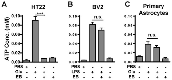 The immunostaining results showed that EB was observed mainly in neurons, accompanied by evidence that EB blocked the increased ATP release level. The question arose of whether ATP release from glial cells is not truly influenced by EB. To address this question, we tested the effect of EB on cultured neurons, microglia, and astrocytes in vitro (Figure 5). HT22 (neuronal cell line), BV2 (microglial cell line), and primary astrocytes were cultured and stimulated by glutamate or LPS with/without incubation with EB prior to stimulus. As a result of activation, the levels of ATP release increased in all groups of the cultured cells (which were not incubated with EB), following glutamate/ LPS stimulus. However, in the group of glutamate-treated HT22, which had been incubated with EB prior to stimulus, the ATP release level was restored to the baseline as in the control groups (Figure 5A). ATP release from BV2 or astrocytes was not affected by EB treatment (Figure 5B,C). There was no significant difference in the levels of ATP release between EB-treated and non-treated groups of cultured microglia and astrocytes. These results indicate that EB may block ATP release from neurons, but not from microglia or astrocytes.