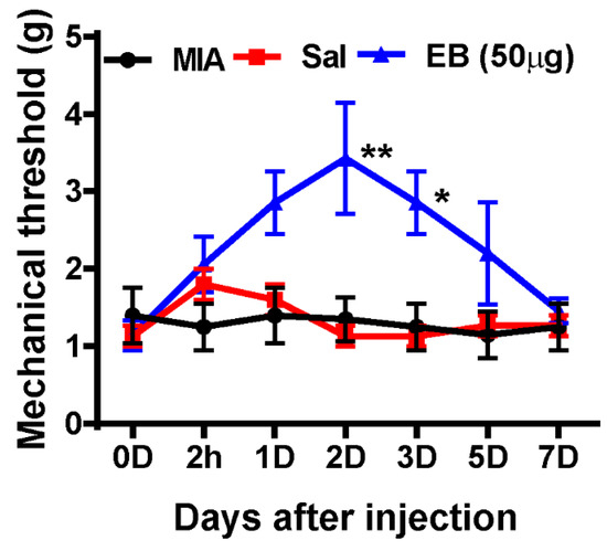 For more evidence of the analgesic effects of EB, we finally attempted to test the influence of EB on a more physiologically relevant disease: osteoarthritis (OA). According to clinical surveys, neuropathic pain-like symptoms are present in a subpopulation (~30%) of patients with OA [34,35]. To establish an OA model in rats, MIA (2 mg in 25 µL saline) was intra-articularly administered to a hind leg, which gradually leads to OA due to the death of chondrocytes in the knee joint cartilage, which is attributed to the inhibition of ATP synthesis in the glycolytic pathway [36]. A similar injection procedure of saline/EB treatment to what was used in the SNL rat model was applied to MIA-induced rats on POD 7. The mechanical thresholds were then determined using von Frey filaments at the same time points of 2 h and 1, 2, 3, 5, and 7 days post-injection (Figure 6). Obviously, MIA induced pain in rats, expressed by the low mechanical thresholds in the MIA-induced group. Notably, the mechanical thresholds of the rats in the MIA EB-treated group were upregulated at 2 h and maintained up to day 5 post-injection. The most significant response was recognized on day 2 post-injection (Figure 6). In contrast, the saline-treated rats did not show any remarkable difference in pain behaviors compared to the MIA-induced rats.