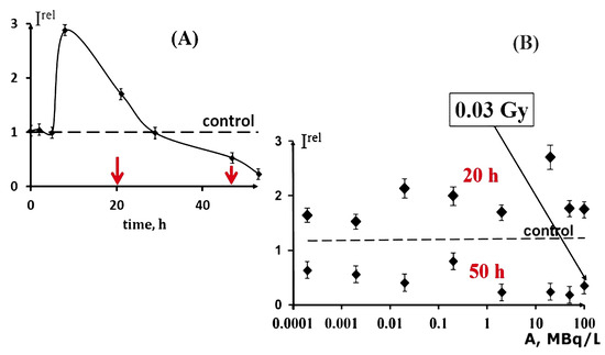 - Rozhko, T.V.; Badun, G.A.; Razzhivina, I.A.; Guseynov, O.A.; Guseynova, V.E.; Kudryasheva, N.S. On mechanism of biological activation by tritium. J. Environ. Radioact. 2016, 157, 131–135. [Google Scholar] [CrossRef] [PubMed]