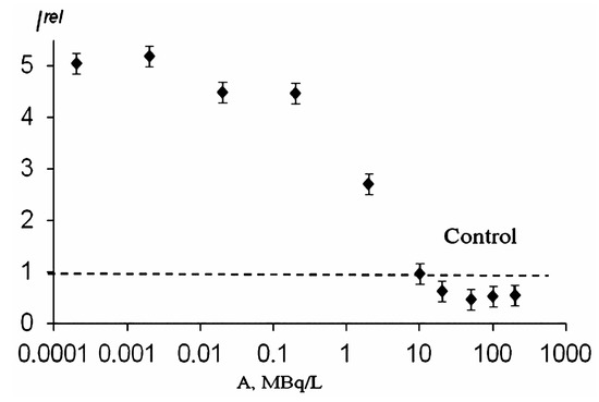- Selivanova, M.A.; Rozhko, T.V.; Devyatlovskaya, A.N.; Kudryasheva, N.S. Comparison of chronic low-dose effects of alpha-and beta-emitting radionuclides on marine bacteria. Cent. Eur. J. Biol. 2014, 9, 951–959. [Google Scholar] [CrossRef]