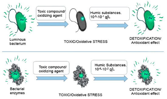- Kudryasheva, N.S.; Tarasova, A.S. Pollutant toxicity and detoxification by humic substances: Mechanisms and quantitative assessment via luminescent Biomonitoring. Environ. Sci. Pollut. Res. Int. 2015, 22, 155–167. [Google Scholar] [CrossRef] [PubMed]
