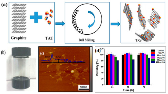 (a) A schematic synthesis of trans-activating transcriptional activator (TAT) peptide-functionalized graphene (TG) via the ball-milling method, (b) digital image of the TG well dispersed in deionized water, (c) atomic force microscopy (AFM) micrograph of the as-prepared TG, and (d) the cell viability of ARPE-19 cells incubated with TG for various lengths of time.