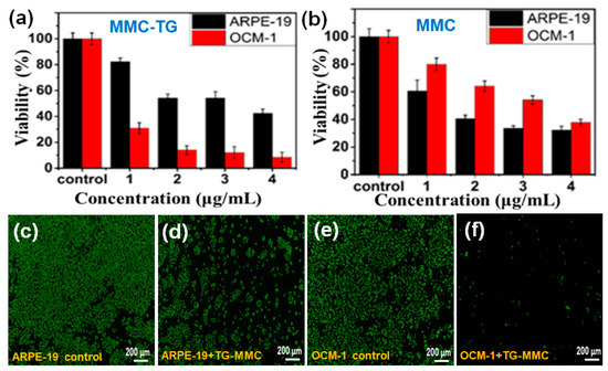 The cell viability of ARPE-19 and OCM-1 cells after being treated with (a) mitomycin C (MMC)-TG and (b) MMC over 72 h and fluorescence micrographs of Calcein-AM stained cells: (c) ARPE-19 cells, (d) ARPE-19 cells incubated with MMC-TG over 72 h, (e) OCM-1 cells, and (f) OCM-1 cells incubated with MMC-TG over 72 h. The concentrations in Figure 2a represent the concentrations of MMC in MMC-TG nanodrugs.