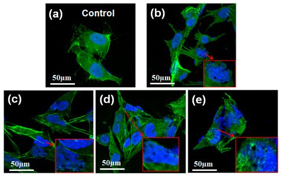 Confocal laser scanning microscopy images of OCM-1 cells marked by fluorescein isothiocyanate (FITC)-phalloidin and 4′,6-diamidino-2-phenylindole (DAPI) after incubation with TG over various time periods: (a) The control, (b) 6 h, (c) 24 h, (d) 48 h, and (e) 72 h. The insets show the magnified images of the corresponding cell parts.