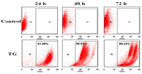 Flow cytometry was further also applied to the quantitative analysis of TG distribution inside OCM-1 cells. TG stained with FITC was incubated with OCM-1 cells for 24, 48, and 72 h. The as-prepared cells were collected and measured with flow cytometry. As shown in Figure 4, it was found that more than 91% of the cells were fluorescent after 24 h. This suggests that dominant cells contained TG after their co-incubation for 24 h. The content of fluorescent cells increased to 95% after 48 h and achieved almost 100% after 72 h. The results from flow cytometry further supported the highly targeted capability of TG to OCM-1 cells of TG and confirmed the high cell-membrane-penetrating capability of TG.