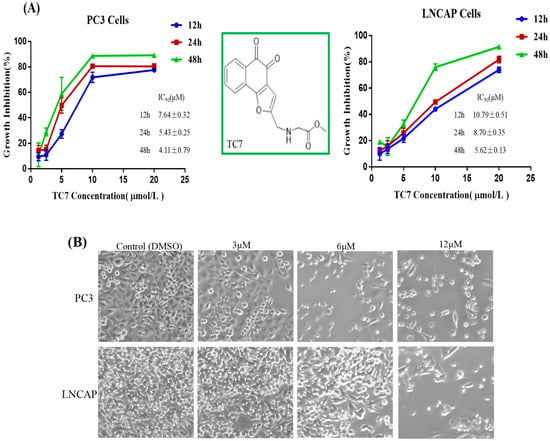 Tanshinones are purified from the traditional Chinese herb Salvia miltiorrhiza Bunge (Danshen) and show various biological activities including angiogenic [], anti-oxidant [], and anti-inflammatory effects [] and are effective against hepatocellular carcinoma []. Recent studies have reported that tanshinones can inhibit the growth of PCa cells and gastric cancer through cell death induction [,]. In our previous works, a series of novel tanshinone derivatives were designed and synthesized to evaluate their anti-cancer activity (manuscript under submission). A series of tanshinone synthetic derivatives showed inhibitory activity on cancer cell proliferation in vitro by inducing cell apoptosis and arresting the cell cycle. Among these active compounds, 2-((Glycine methyl ester)methyl)-naphtho[1,2-b]furan-4,5-dione (TC7, the structure shown in Figure 1A), exhibited the most potent anti-cancer activity with better selectivity and lower toxicity, representing a potential candidate against PCa. Therefore, in this work, the effect of TC7 was investigated on human PCa cell growth, invasion, and migration, including its molecular mechanisms of action.