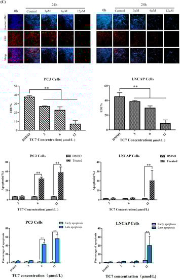 Several protocols were used to check the effect of TC7 on the proliferation of PCa cells to determine whether this compound could induce apoptosis in cancer cells (Figure 1). MTT assay results showed that the proliferation of the two PCa cell lines, PC3 and LNCAP, was significantly inhibited by TC7 treatment in a time- and concentration-dependent manner (Figure 2A). At 48 h, the IC50 value of TC7 on PC3 was 4.11 ± 0.79 μM, and on LNCAP it was 5.62 ± 0.13 μM, both similar to the IC50 of doxorubicin used as the positive control (IC50 = 3.47 ± 0.43 on PC3, IC50 = 4.45 ± 0.81 μM on LNCAP), indicating that TC7 had a stronger anti-proliferation activity. Further IC50 value comparisons at different times between the two cells showed that the inhibitory effect of TC7 on PC3 proliferation was stronger than that exerted on LNCAP at 12, 24, and 48 h. In addition, the decrease in cell number was concentration-dependent, as shown by the fluorescence microscope images (Figure 2B), since the number of cells decreased significantly as the compound concentration increased. Moreover, some apoptotic bodies were observed in the cells treated with 3, 6, and 12 μmol/L TC7 at 48 h, suggesting that TC7 induced apoptosis in PC3 and LNCAP cells. To confirm the inhibitory effect of TC7 on cell proliferation, a EDU-DNA synthesis assay was performed (Figure 1C). Treatment with 3, 6, and 12 μM TC7 for 24 h resulted in a dose- and time-dependent proliferation inhibition in both the two cancer cells used. The results showed that the number of cells stained with EDU and Hoechst 33342 decreased with the increase of TC7 concentration (p < 0.01) in both PC3 and LNCAP cells, thus TC7 suppressed viability and proliferation of human PCa cells by inducing DNA synthesis-dependent apoptosis.