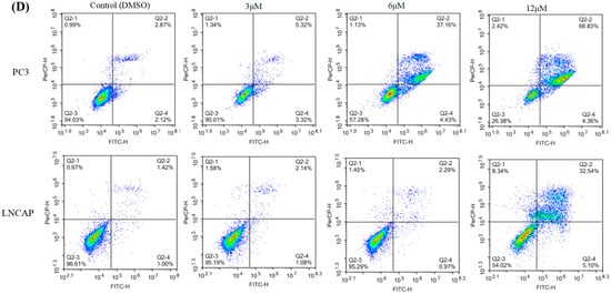 Flow cytometry was used to detect the apoptotic effect of TC7 on the two PCa cells. Flow cytometry assay results (Figure 1D) showed that apoptosis in PC3 cells treated with 3 μM TC7 was not significant compared to the control, but 6 and 12 μM TC7 resulted in a remarkably significant apoptosis (p < 0.01) compared with the control group. Apoptosis in LNCAP cells treated with 3 and 6 μM TC7 was not significant compared to the control, but apoptosis was also remarkably significant (p < 0.01) in the cells treated with 12 μM TC7 compared with that in the control group. The analysis of the ratio of early and late apoptosis showed that apoptosis due to higher concentrations of TC7 was mainly late apoptosis in both the two cancer cells. These results revealed a certain difference in the apoptotic effect of TC7 on the two PCa cells used, but the higher concentration of TC7 induced apoptosis in both.