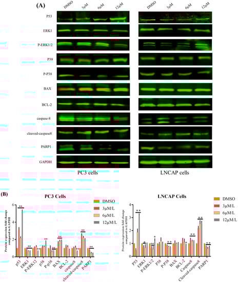 To explore the mechanism of TC7-induced apoptosis, the expression of key apoptosis-associated proteins was assayed by western blotting in TC7-treated PCa cells (Figure 2). The results showed that TC7 significantly up-regulated p53 (p < 0.01), p38 (p < 0.01), BAX (p < 0.01) and cleaved caspase-8 (p < 0.01), while down-regulated ERK1 (p < 0.01) and PARP1 (p < 0.01) protein expression in PC3 cells compared with the control (DMSO treatment), and significantly decreased caspase-8 expression when treated with TC7 at high concentration (12 μM) compared to the control (p < 0.05), while the increase/decrease of BCL-2 expression was not significant. However, in LNCAP cells, TC7 showed some differences in the regulation of the expression of the same proteins mentioned above. Indeed, TC7 significantly increased p53 (p < 0.01), caspase-8 (p < 0.01), cleaved caspase-8 (p < 0.01), and decreased PARP1, ERK1 (p < 0.05) protein expression, and significantly decreased BCL-2 expression (p < 0.05) when treated with a high concentration of TC7 (12 μM) compared to the control, but the increase/decrease of p38 and BAX expression was not significant. In addition, TC7 effect on the phosphorylation of two proteins associated to apoptosis was evaluated in the two cancer cells used. The results showed that ERK1 phosphorylation (p-ERK1/2) was significantly decreased when PC3 cells were treated with a high TC7 concentration (12 μM) (p < 0.01), while p38 phosphorylation (p-p38) was significantly decreased (p < 0.01) when PC3 cells were treated with a low TC7 concentration (3–12 μM) compared to the control. In LNCAP cells treated with TC7 concentration, the phosphorylation of the two proteins was significantly decreased compared to the control (p < 0.01). In summary, TC7 induced apoptosis of PCa cells through the regulation of key apoptotic proteins such as p53, ERK1, BAX, p38, BCL-2, caspase-8, cleaved caspase-8, and PARP1 as well as influencing the phosphorylation of ERK1 and p38 in the p38/p53/caspase 8 signaling pathway.