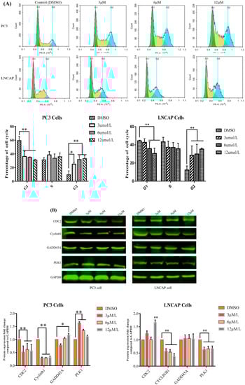 Effect of TC7 on cell cycle of PCa and LNCAP cells. Cells were treated with TC7 at different concentrations (3, 6, and 12 μM) for 24 h. (A) Effect of TC7 on the cell cycle of PCa and LNCAP cells by flow cytometry. Cells were fixed and stained with propidium iodide (PI) to analyze the DNA content by flow cytometry. The bar graph shows PC3 and LNCAP cells percentage in different phases of the cell cycle. (B) TC7 effect on the expression of proteins involved in the cell cycle of PCa and LNCAP cells by western blot and quantitatively analyzed by Image J software. Results are presented as mean ± SD from three independent experiments. * p < 0.05 (n = 3); ** p < 0.01 (n = 3), compared with the control group.
