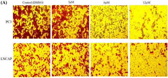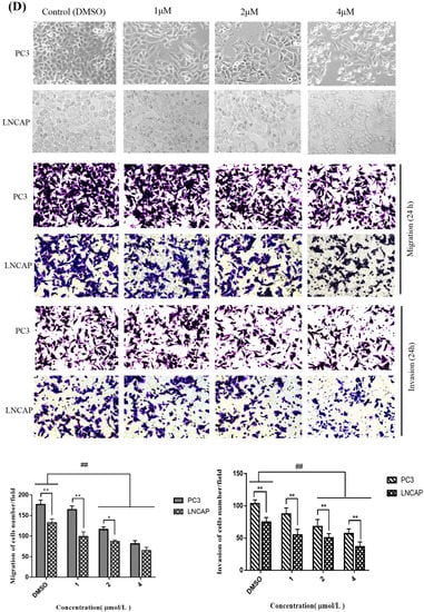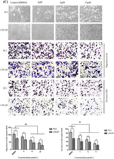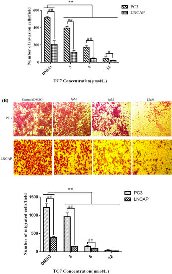 Effect of TC7 on migration and invasion ability of PCa cells. Migration (B) and invasion (A) of PC3 and LNCAP cells was evaluated by Transwell assay. Cells were treated with TC7 at different concentrations (3, 6, and 12 μM) for 24 h. The number of migrated and invading cells were quantified and compared with the DMSO group. Scale bar = 100 μm in all images. (C,D) Effect of lower concentrations of TC7 at relatively short treatment times on the invasion and migration of cancer cells. (E) Effect of TC7 on the expression of proteins involved in migration and invasion by western blot and quantified by Image J software. Results are presented as mean ± SD from three independent experiments. * p < 0.05 (n = 3); ** p < 0.01 (n = 3), compared with the control group; ## p < 0.01 (n = 3), compared between two cancer cell lines.