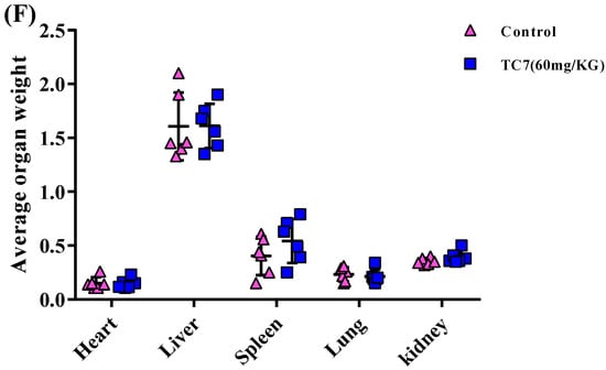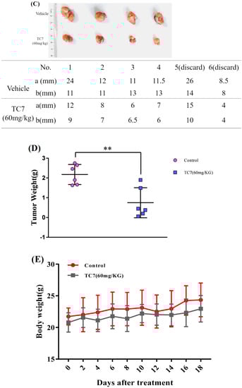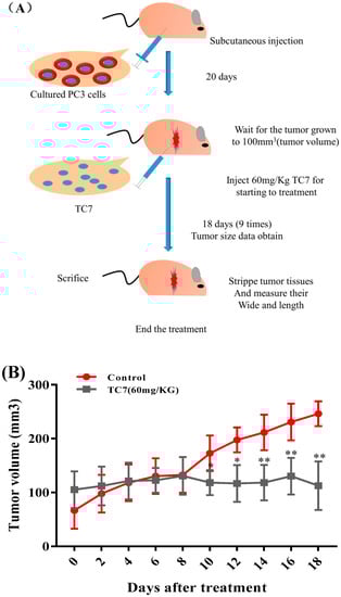 The xenotopic tumor model was obtained by a hypodermic injection of PC3 cells in nude mice to prove anti-PCa activity of TC7 in vivo (Figure 5). The results showed that the tumor volume in the group treated with TC7 every two days decreased in size with the increase of the treatment time starting from day 10 compared with the control group (p < 0.05 and p < 0.01) (Figure 3B), although no significant difference in the tumor volume in the first eight days was observed. After tumor removal, width and length were measured (Figure 5C). The results showed that the tumor weight in the TC7-treated mice after 18 days treatment with TC7 was significantly smaller than that of the control group (p < 0.01) (Figure 3D), suggesting a potential anti-tumor activity in vivo. The result of body weight in all nude mice injected with PC3 cells before being sacrificed showed no significant difference between the TC7-treated mice and the control group, indicating that the drug was exerting a low toxicity in vivo (Figure 5E). In addition, the main organs, such as heart, liver, spleen, lung, and kidney were collected from the tumor-bearing mice and weighted (Figure 5F). The results showed no significant differences in the weight of all the organs between the treated group and the control group, suggested that TC7 had no significant effect on the main functional organs in vivo.