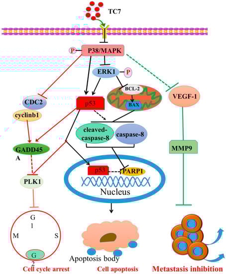 The proposed cell signaling pathways used by TC7 to induce PCa cell apoptosis, cell cycle arrest, and metastasis inhibition through the regulation of p38/cyclin b1/CDC2, and p53-dependent GADD45A/PLK1, p38/P53/caspase 8, and p38/VEGF-1/MMP-9 signaling pathway.