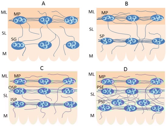 The organization of the enteric nervous system in various mammal species: A–oesophagus and stomach of the vast majority of mammal species, B–small and large intestine of rodents, C–small and large intestine of the domestic pig, D–human small and large intestine. ML = muscular layer, SL = submucosal layer, M = mucosal layer, MP = myenteric plexus, SG = submucous ganglia, SP = submucous plexus, OSP = outer submucous plexus, ISP = inner submucous plexus, PSE = plexus submucosus externus, PSI = plexus submucosus internus