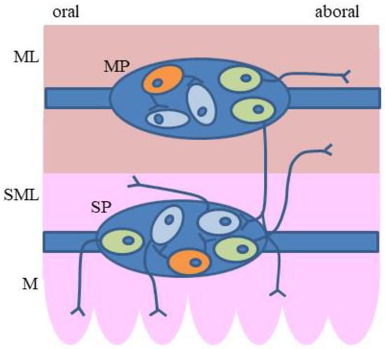 The distribution of two main types of somatostatin (SOM)-positive enteric neurons (secretomotor neurons and interneurons) in the guinea pig intestine: green–SOM-positive secretomotor neurons, orange–SOM-positive interneurons, blue–other neurons, ML = muscular layer, SML = submucosal layer, M = mucosal layer, MP = myenteric plexus, SP = submucous plexus.
