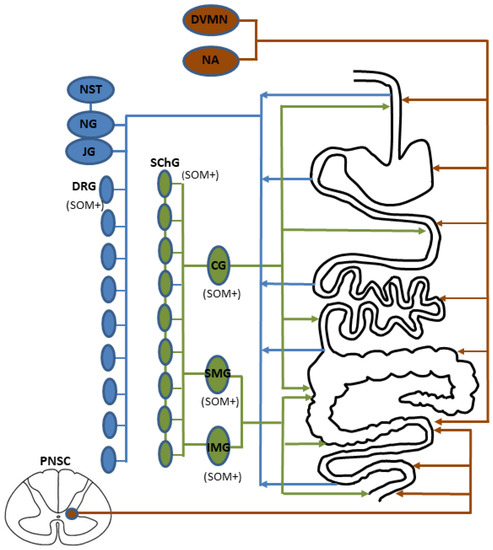 Organization of the extrinsic innervation of the gastrointestinal tract: blue–sensory innervation, green–sympathetic innervation, brown–parasympathetic innervation, DVMN = dorsal vagal motor nucleus, NA = nucleus ambiguous, PNSC = parasympathetic nuclei of the sacral spinal cord, NST = nucleus of the solitary tract, NG = nodose ganglion, JG = jugular ganglion, DRG = dorsal root ganglia, SChG = ganglia of the sympathetic trunk, CG = celiac ganglion, SMG = superior mesenteric ganglion, IMG = inferior mesenteric ganglion. Structures, where SOM was observed in neurons supplying the gastrointestinal tract are marked by “(SOM+)”.