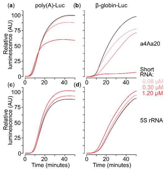 2.2. eIF4A-Blocking RNA Aptamer Does Not Affect Translation of Capped Poly(A) 5′UTR mRNA