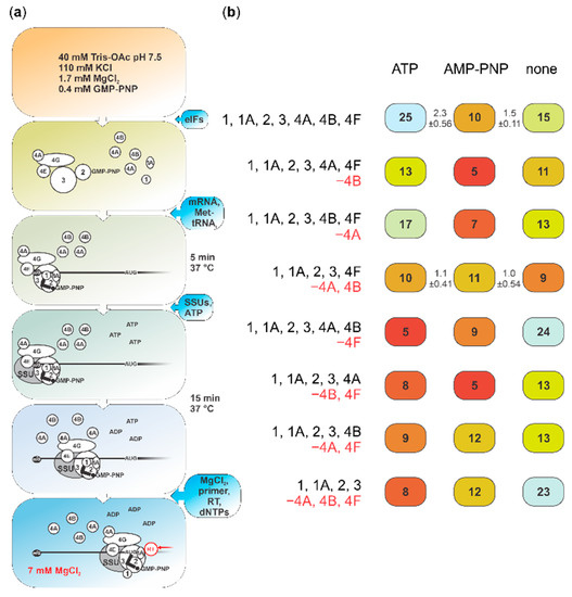 - Kozak, M. Role of ATP in binding and migration of 40S ribosomal subunits. Cell 1980, 22, 459–467. [Google Scholar] [CrossRef]