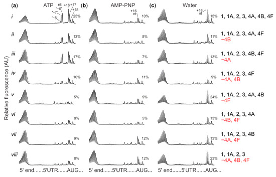 2.3. Presence of AMP-PNP Decreases Efficiency of SSU Complex Assembly at the Start Codon of Capped Poly(A) 5′UTR mRNA
