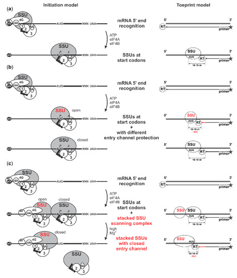 - Llacer, J.L.; Hussain, T.; Marler, L.; Aitken, C.E.; Thakur, A.; Lorsch, J.R.; Hinnebusch, A.G.; Ramakrishnan, V. Conformational Differences between Open and Closed States of the Eukaryotic Translation Initiation Complex. Mol. Cell 2015, 59, 399–412. [Google Scholar] [CrossRef] [PubMed]