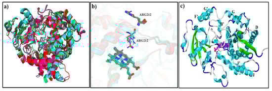 Superposition of chain A in CYP3A4 crystal structures (a) 1TQN (red), 3UA1 (cyan), 3NXU (green) and 4K9W (pink); (b) positioning of Arg212 within 1TQN (red), 3UA1 (cyan), 3NXU (green) and 4K9W (pink); and (c) the structural organization of 1TQN.