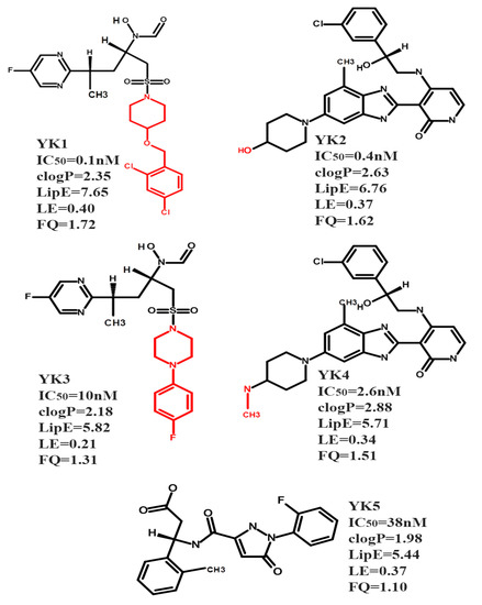 Initially, the concept of drug efficiency metrics has been applied for the selection of efficient modulators against true drug targets []. Recently, drug efficiency metrics were used to select the highly efficient inhibitors of CYP450 isoforms which represents an anti-target []. Only five CYP3A4 inhibitors (Figure 2) out of the large data set of 2747 compounds (Table S1) showing the defined thresholds (Materials and Methods and Section S1) of activity (IC50: 0.1–38 nM), clogp (1.98–2.88), lipophilic efficiency (LipE) (5.44–7.65), ligand efficiency (LE) (0.21–0.40 kcal mol−1 HA-1) and fit quality ≥1 (Figure S1a,b) were selected for further docking and molecular dynamics studies to probe the binding hypothesis within the active site of CYP3A4.