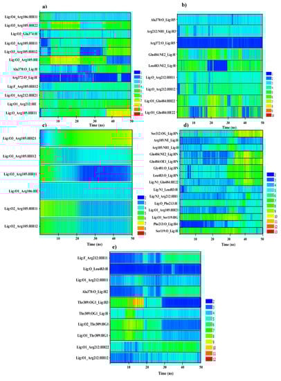 The time dependent distance analysis of (a) CYP3A4-YK1; (b) CYP3A4-YK2; (c) CYP3A4-YK3; (d) CYP3A4-YK4; and (e) CYP3A4-YK5 residues and inhibitor groups involved in hydrogen bonding. The distances are measured in Angstrom (Å) and the time is shown along the x-axis.
