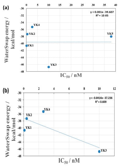 (a) The correlation between the binding free energy of the complex predicted by WaterSwap and the IC50 values for YK1–5. (b) The correlation between the binding free energy of the complex predicted by WaterSwap and the IC50 values with the data for YK5 removed as it is a significant outlier compared to the other compounds. Note that the values for YK4 and YK5 are the average of WaterSwap calculations using two different starting structures to ensure that the structures were representative of the entire MD trajectory.