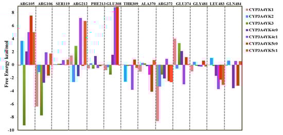 Raza et al. have shown that in comparison to the MM/PBSA analysis, the WaterSwap method identifies more residues with significant contribution to the calculated binding energies []. Additional insight can be obtained from the WaterSwap calculations as the binding free energy can be decomposed in terms of individual residue contributions. It is important to emphasize that the interaction energies calculated through this method are not directly comparable to experimental results (e.g., ΔΔG for mutated enzymes) nor will they sum to the total binding energy; however, this type of decomposition analysis might be useful for the identification of residues that have the largest effects on the binding energy. The residue decomposition can be visualized and analyzed using the CHEWD plugin for Chimera or PyMol []. The residue decomposition indicates favorable and unfavorable interactions, information that is useful for lead development. Here, the WaterSwap residue-wise binding energy decompositions were analyzed for the residues with greatest contributions to the inhibitor binding throughout the course of MD simulations. These include 13 residues (Arg105, Arg106, Ser119, Arg212, Phe213, Glu308, Thr309, Ala370, Arg372, Glu374, Gly481, Leu483, and Gln484) for which the total Gresidue components are shown in Figure 5. For YK1–5 the binding energy calculations based on the first centroid clusters show negative free energies of Arg106 and Arg372 for all five selected CYP3A4 inhibitors, favoring the stabilization of the inhibitor–protein complexes through van der Waals and hydrogen bond interactions. Whereas, the binding energy calculations for YK4 based on the second cluster show positive free energies for both Arg106 and Arg372 and only Arg106 for YK5 (Figure 5).