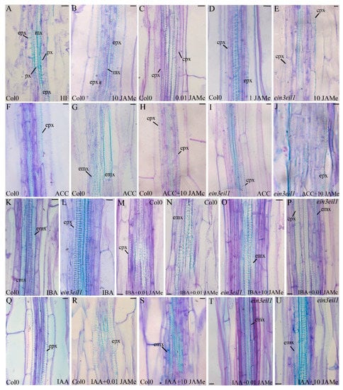 2.1. A Specific Concentration of Exogenous JAMe Enhances Ectopic Protoxylem Formation but its Combination with ACC Reduces it, without Affecting Xylary Identity