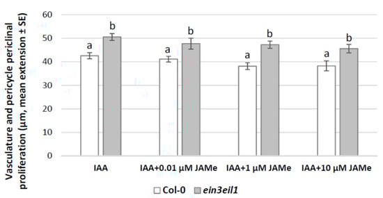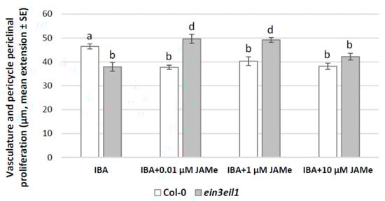 | IAA + 1 µM JAMe | 2.5 ± 0.2 b | 2.2 ± 0.3 b | 33.3 | 66.7 | 25 | 75 |