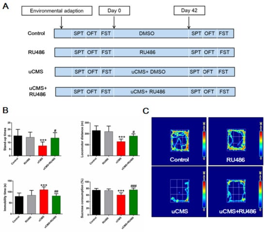 The study design and uCMS procedure are presented in Figure 1A and Supplementary Table S1, respectively. Following six weeks of uCMS exposure (Figure 1B), rats in the uCMS group (stress + vehicle) showed decreased stand-up times, locomotor distance, and sucrose consumption (%), and increased immobility time (all p values < 0.001) as compared to the control group (no stress + vehicle). However, rats in the uCMS + RU486 group showed increased stand-up times (p = 0.010), locomotor distance (p = 0.015), sucrose consumption (%) (p < 0.001), and decreased immobility time (p = 0.002) as compared to rats in the uCMS group (stress + vehicle). These results demonstrate that the uCMS model was successfully established and that RU486 was associated with antistress effects. Figure 1C shows a heat map of the rats’ motion trail in the open-field test (OFT).