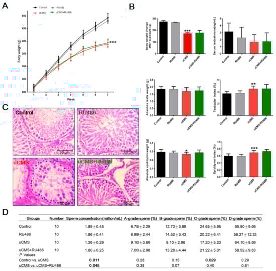 As shown in Figure 2A, a repeated-measures two-way ANOVA of body weight revealed significant differences in between-subject variation (F (3,140) = 148.3, p < 0.001), within-subject variation (F (6,140) = 908.2, p < 0.001), and interaction of group × time (F (18,140) = 14.49, p < 0.001). After six weeks of uCMS treatment (Figure 2B), rats in the uCMS group had significant decreased body weight change after exposure (173.50 ± 7.23 versus 274.67 ± 8.91 g, p < 0.001) and absolute epididymis weight (0.27 ± 0.02 versus 0.30 ± 0.03 g, p = 0.041) as compared to control group rats. There was no statistically significant difference in testis weight (1.73 ± 0.22 versus 1.85 ± 0.20 g, p = 0.58) and serum testosterone levels (1.69 ± 1.04 versus 3.16 ± 1.23 ng/mL, p = 0.06) between the uCMS group and the control group. However, testicular index (4.44 ± 0.41 versus 3.75 ± 0.39‰, p < 0.01) and epididymal index (0.69 ± 0.06 versus 0.60 ± 0.06‰, p < 0.001) were increased in uCMS-treated rats as compared to rats in the control group. We also observed significant testicular structural damage in rats following chronic stress exposure. H&E-stained sections of testes showed that significant histological changes occurred in seminiferous tubules (Figure 2C). uCMS-treated rats showed decreases in seminiferous tubule diameter (135.12 ± 4.80 versus 210.79 ± 5.22 μm; p < 0.001) and epithelial height (50.38 ± 4.91 versus 75.93 ± 4.79 μm, p < 0.001) as compared to control group rats. Additionally, significant decreases in sperm concentration (1.36 ± 0.29 versus 1.89 ± 0.45 million/mL, p = 0.011) and C-grade sperm (%) (17.20 ± 5.23 versus 24.65 ± 5.98%, p = 0.029) were detected in rats exposed to chronic stress (Figure 2D). Our data also demonstrated that RU486 cotreatment alleviated the toxic testicular-related effects of chronic stress and improved testicular structure. Rats in the uCMS + RU486 groups had an enlarged seminiferous tubule diameter (200.47 ± 4.37 versus 135.12 ± 4.80 μm, p < 0.001), increased epithelial height (71.00 ± 4.30 versus 50.38 ± 4.91 μm, p < 0.001), and higher sperm concentration (1.80 ± 0.25 versus 1.36 ± 0.29 million/mL, p = 0.045) as compared to the rats in the uCMS group. When compared to rats in the control group, rats in the uCMS + RU486 groups had a decreased seminiferous tubule diameter (200.47 ± 4.37 versus 210.79 ± 5.22 μm; p < 0.001). RU486 administration did not ameliorate the decline in weight gain (p = 0.83) or serum testosterone (p = 0.90) in rats exposed to chronic stress.