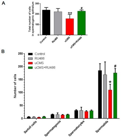 The aforementioned results show that the seminiferous tubules of the uCMS group underwent significant pathological changes. To further explore the cells targeted by stress-induced spermatogenesis impairment, cells were counted within the spermatogenic epithelium (including Sertoli cells, spermatogonia, spermatocytes, and spermatids). The different types of cells within the spermatogenic epithelium are marked in Supplementary Figure S1A, and refer to the description presented in a previous study [15], and the spermatogenic epithelium of SD rats in different groups is shown in Supplementary Figure S1B. As shown in Figure 3A,B, the total number of cells within the spermatogenic epithelium decreased significantly in the uCMS group as compared to the control group (156.75 ± 40.44 versus 239.50 ± 23.81, p = 0.007). This decrease may have contributed to the marked decrease in the number of spermatids in the uCMS group (110.50 ± 21.98 versus 185.50 ± 26.36, p = 0.023). In addition, RU486 cotreatment caused a significant increase in the total number of cells within the spermatogenic epithelium (228.75 ± 10.87 versus 156.75 ± 40.44, p = 0.018) and spermatids numbers (176.25 ± 16.64 versus 110.50 ± 21.98, p = 0.048). These data indicate that the chronic stress-induced decrease in sperm concentration may originate from a decrease in the number of germ cells in the seminiferous tubules, especially from the specific reduction of spermatids.