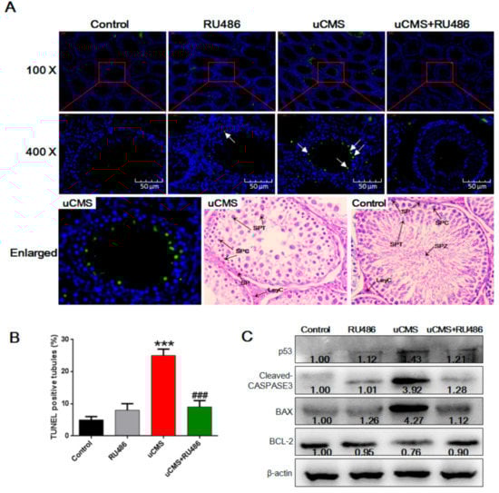 To further elucidate the reasons for the reduction in spermatids, apoptosis of testicular cells was investigated using the terminal deoxynucleotidyl transferase-mediated dUTP-biotin nick end labeling (TUNEL) method. According to the analytical methods of a previous study [16], we found that the proportion of TUNEL-positive tubules (tubules with more than six TUNEL-positive cells) was significantly increased in the uCMS group (Figure 4A,B, 25.02 ± 2.11% versus 5.22 ± 1.00%, p < 0.001). Based on microscopy (400), the majority of apoptotic cells were spermatids. These results indicate that chronic stress may reduce the number of spermatids by inducing cell apoptosis. The levels of proteins associated with the apoptotic pathway were analyzed (Figure 4C). Compared to the controls, the activity of cleaved CASPASE 3, p53, and the ratio of the BCL-2-associated X (BAX; a proapoptotic protein) to B cell leukemia/lymphoma 2 (BCL-2; an antiapoptotic protein) were significantly increased (all p values < 0.001). RU486 cotreatment significantly ameliorated testicular cell apoptosis induced by uCMS (9.13 ± 2.36% versus 25.02 ± 2.11%, p < 0.001) and caused a marked normalization of protein levels in the apoptotic pathway (all p values < 0.05).
