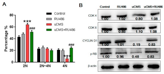 Figure 5 shows the distribution of DNA content of early spermatogenic cells, including spermatogonia (DNA content: 2N~4N) and primary spermatocytes (DNA content: 4N). The “N” in our study represents DNA content, not the number of chromosomes. 4N germ cells include primary spermatocytes and G2-phase spermatogonia in the mitotic cell cycle [17]. As shown in Figure 5A, uCMS treatment significantly increased the proportion of 2N cells (63.80 ± 2.71% versus 43.30 ± 3.10%, p < 0.001). There were no significant differences in the number of spermatocytes between each group, according to the results shown in Figure 3B (p = 0.81). Thus, a reduction in 4N germ cells may be due to the decrease in G2-phase spermatogonia (4N) but not to the decrease in spermatocyte numbers. In other words, the increased proportion of 2N cells may be due to mitotic cell cycle arrest of spermatogonia at the G0/G1 phase. The results of the Western blot analysis further support this hypothesis (Figure 5B). Levels of three important regulatory proteins (cyclin-dependent kinase 4 [CDK4], CYCLIN D1, and phospho-Retinoblastoma [p-RB]) that are necessary for transformation of G0/G1 phase to S phase were significantly decreased (p = 0.030, p < 0.001, and p < 0.001, respectively). Similarly, RU486 cotreatment normalized the proportion of 2N cells (50.15 ± 2.91% versus 63.80 ± 2.71%, p < 0.001) and caused an increase in the protein levels of CDK4, CYCLIN D1, and p-RB (p = 0.006, p < 0.001, and p = 0.016, respectively). The above results indicate that chronic stress induces cell cycle arrest of spermatogonia at the G0/G1 phase.