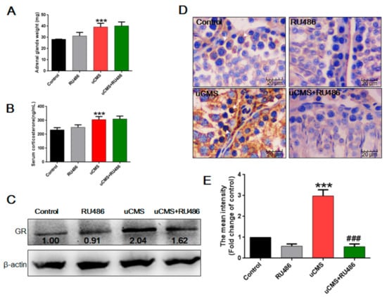 Adrenal gland weight (39.19 ± 3.33 versus 28.29 ± 3.11 mg, p < 0.001) and serum corticosterone levels (305.47 ± 22.00 versus 231.92 ± 15.73 ng/mL, p < 0.001) were higher in stressed rats as compared to the control group (Figure 6A,B). In addition, Western blot analysis (Figure 6C) showed that stress induced an average twofold increase in GR protein expression level in the testes, as compared to the control (p < 0.001). Immunohistochemistry was used to detect the in situ expression of GRs in the testes. As shown in Figure 6D, control rats showed a low basal expression level of GR, while rats in the uCMS group showed a strong positive staining of GR expression in male reproductive cells, especially in spermatogonia and spermatocytes. Quantitative analysis (Figure 6E) showed that uCMS exposure increased GR expression approximately threefold as compared to control rats (p < 0.001). With respect to the effects of RU486 on uCMS-induced GR expression, results of Western blot and immunohistochemistry showed that RU486 partially reversed the increased levels of GR protein induced by uCMS exposure (Figure 6C,D, p < 0.001). However, no significant differences were found between the uCMS and uCMS + RU486 groups for the adrenal gland weight (39.19 ± 3.33 versus 40.20 ± 3.51 mg, p > 0.05) and levels of serum corticosterone (305.47 ± 22.00 versus 310.01 ± 21.02 ng/mL, p > 0.05) (Figure 6A,B). These data indicate that stress activates the HPA axis, resulting in elevated adrenal gland weight and serum corticosterone levels, while the GR antagonist RU486 had no effect on the activation of the HPA axis by uCMS but alleviated high GR levels induced by uCMS in the testes.