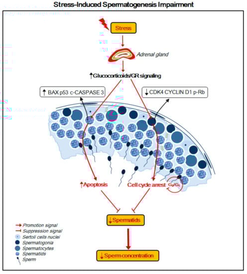 The negative association between psychological stress and male fertility has been known for many years. The first published study that examined the effect of psychological stress on testicular spermatogenesis was conducted in 1977 [1]. These researchers found that Sertoli cells and spermatogonia were the only cell types found in the seminiferous tubules in some prisoners who were kept waiting for a long time before execution. In recent years, epidemiological studies found that there is a negative relationship between various psychological stress factors and male fertility [2,3,4]. In a study of 1215 young Danish men, researchers found that subjects with high levels of self-reported stress had worse semen parameters than subjects with low levels of self-reported stress [2]. This phenomenon has also been demonstrated in animal experiments. For example, immobilization stress induced downregulation of testosterone synthesis genes such as scavenger receptor class b member 1 (Scarb1), steroidogenic acute regulatory gene (Star), and cytochrome P450 family 17 subfamily A member 1 (Cyp17a1) expression in testes; this downregulation led to a significant decrease in plasma testosterone levels [5]. Using a cold water immersion-induced stress model in rats, Juarez-Rojas et al. reported that stress can potentially activate intrinsic/extrinsic apoptosis pathways in testes resulting in reduced testosterone levels [6]. Glucocorticoids, which are a hallmark of stress, were found to have similar toxic effects on male reproduction. Researchers found that dexamethasone-treated rats had 10 times more apoptotic germ cells than the control group [7].