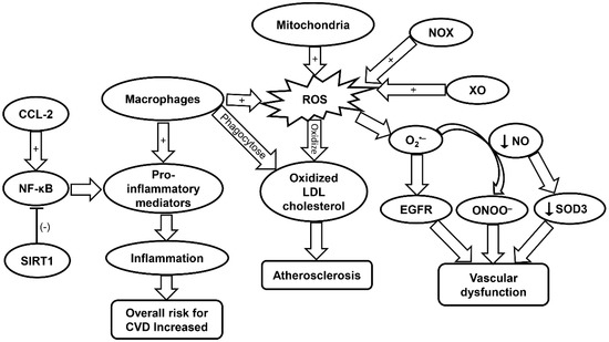 Schematic summarizing the molecular mechanisms contributing to CVD progression. CCL-2, chemokine (C-C motif) ligand 2; CVD, cardiovascular disease; EGFR, epidermal growth factor receptor; LDL, low density lipoprotein; NF-κB, nuclear factor kappa-light-chain-enhancer of activated B; NOX, NADPH oxidase; ROS, reactive oxygen species; SIRT1, sirtuin-1; SOD, superoxide dismutase; XO, xanthine oxidase.