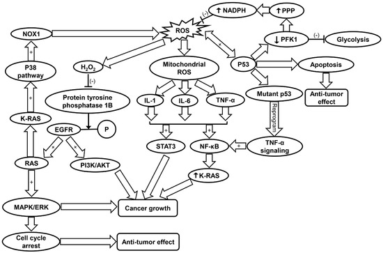 ROS regulate inflammation through activation of pro-inflammatory cytokines and NLRP3 inflammasome [56,143]. Specifically, mitochondria-derived ROS formation is found to induce the upregulation of IL-1, IL-6, and TNF-α [56]. These cytokines have been shown to activate NF-κB and signal transducers and activators of transcription 3 (STAT3), both of which have been implicated in cancer growth [51,52,53]. TNF-α has been found to induce tumorigenesis via generation of ROS and subsequent damage of DNA [49]. Mutant p53 has been shown to reprogram TNF-α signaling to favor NF-κB activation over the ASK1/JNK pathway [54]. NF-κB can increase oncogenic K-Ras levels in a positive feedback loop, further correlating chronic inflammation with cancer progression (Figure 2 and Table 1) [55]. Furthermore, most target genes of IL-6 are involved in cell survival and proliferation, thereby contributing to cancer cell growth [144]. Inhibition of IL-1 suppressed growth of head and neck squamous carcinoma cells, indicating its role in tumorigenesis [145].