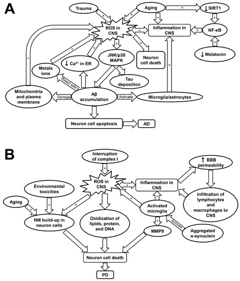 ROS-induced oxidative stress plays a critical role in the pathogenesis of AD (Table 1) [16]. Although it remains debated whether increased ROS formation is the primary cause or a consequence of AD, severe oxidative stress was detected in the early stage of AD even prior to the marked Aβ accumulation [162]. It has been shown that increased ROS production contributes to Aβ accumulation and Tau hyper-phosphorylation via the activation of JNK/p38 MAPK pathways (Table 1) [16]. The deposition of Aβ disturbs Ca2+ balance in endoplasmic reticulum (ER) as well as damages mitochondrial and plasma membrane, which exacerbates ROS production [62]. The Aβ plaque-activated microglia and astrocytes also perform as primary sources for ROS in AD [12]. In addition, Aβ plaques contain high levels of metal ions such as copper and iron, which facilitate the formation of H2O2 through the reaction between Aβ plaques and the metal ions [63]. The excess ROS accumulation has been implicated in the death of neuron cells via its attacking to DNA, lipids, or protein leading to neuron apoptosis (Figure 3A and Table 1) [63].