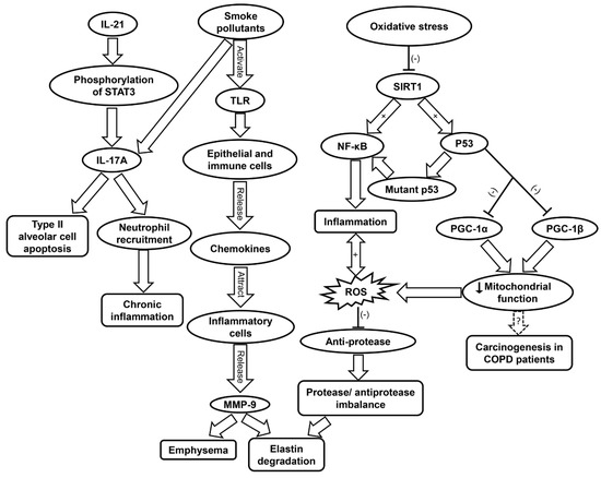 Inflammaging has been found to accelerate the progression of COPD [74]. Oxidative stress contributes to inflammaging by reduction of SIRT1 activity, which results in increased acetylation of p53, NF-κB, and FOXO3 (Table 1) [77]. Wild-type p53 protects against oxidative stress via its antioxidant transcription factor activity under normal condition [46]. However, under oxidative stress, p53 may exhibit pro-oxidant properties [45]. p53 can also contribute to inflammation by TLR regulation [196]. Mutant p53 produces mutant proteins and activates NF-κB transcriptional activity, both of which contribute to inflammation [196,197]. Indeed, polymorphisms of p53 have been linked to the pathogenesis of COPD via apoptotic signaling and emphysematous changes [79]. The activation of p53 can also result in diminished mitochondrial function due to its inhibition of PGC-1α and PGC-1β transcription. Damage to the mitochondria is involved in the pathogenesis of COPD [78]. The affected airways of COPD patients feature increased levels of mitochondrial ROS and exacerbated inflammation [80,81]. Mitochondrial dysfunction has also been hypothesized as a driving force of carcinogenesis in COPD patients (Figure 4 and Table 1) [80].