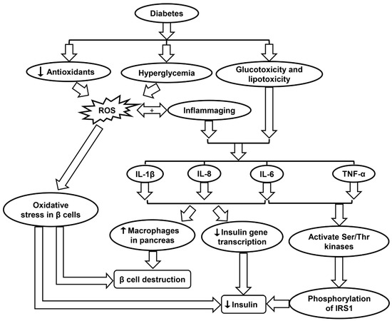 Inflammation may even influence the development of diabetes in an otherwise healthy individual. Hotamisligil et al. showed that insulin signal transduction can be disrupted by inflammatory cytokines, resulting in insulin resistance [87]. As an example, TNF-α and IL-6 activate multiple Ser/Thr kinases, which then catalyze serine phosphorylation of insulin receptor substrate 1 (IRS1). The phosphorylation of IRS1 disrupts its capability to mobilize phosphatidylinositol-3-kinase and Akt, causing disturbances in the body’s insulin processing mechanism (Table 1). Ser/Thr kinases such as JNK and IKK-b are two important factors that affect insulin signaling, further indicating that inflammatory tracks in bodily tissues can foster the inception of Type II diabetes [87]. Furthermore, inflammation may prompt the breakdown of β-cells. IL-1β, IL-6, and IL-8 production is increased in pancreatic islets due to glucotoxicity and lipotoxicity in diabetes. The presence of these pro-inflammatory molecules decreases insulin gene transcription and increases the presence of macrophages in the pancreas, ultimately inducing β-cell apoptosis (Figure 5 and Table 1) [87]. Anti-inflammatory treatments that may improve such conditions as diabetes include limited caloric intake, SIRT1 activators, and p38-MAPK inhibitors (Table 1) [88].