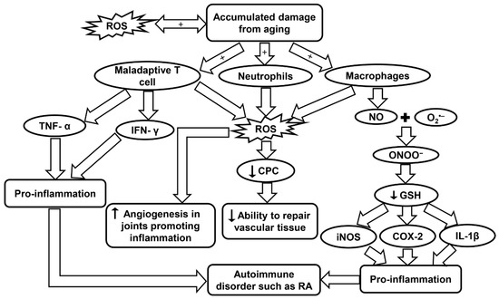 Free radicals have proven to be an important aspect for consideration due to their association with inflammaging in RA. In a study by Mateen et al., RA patients were observed to have a higher rate of formation of ROS, as well as, lipid peroxidation, DNA damage, and protein oxidation. It was concluded that the oxidative stress may be linked with the chronic aspect of the disease [209]. In a population study by Kundu et al., synovial fluid was obtained from RA patients and the cellular components were isolated. Neutrophils, macrophages, and lymphocytes were identified as the major contributors in the pathogenesis of the disease. These cells generate ROS through NOX, a membrane-bound enzyme. Oxidative stress may cause abnormalities in signaling and proliferation of T lymphocytes that aid in the pathogenesis as explained earlier (Table 1). It was also observed that neutrophils were producing three times more ROS than macrophages. Macrophages, however, produced high levels of NO, which has an important role during the oxidative burst seen in inflammation [95].