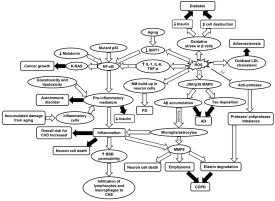 Schematic summarizing the primary molecular signaling involved in different diseases including CVD, cancer, AD, PD, COPD, diabetes, and RA. AD, Alzheimer’s disease; Aβ, amyloid beta plaques; BBB, blood brain barrier; COPD, chronic obstructive pulmonary disease; CVD, cardiovascular disease; IL-1, interleukin-1; IL-6, interleukin-6; JNK/p38 MAPK, c-Jun N-terminal kinase/p38 mitogen-activated protein kinase; LDL, low density lipoprotein; MMP9, matrix metalloprotease 9; NF-κB, nuclear factor kappa-light-chain-enhancer of activated B; SIRT1, sirtuin-1; PD, Parkinson’s disease; ROS, reactive oxygen species; TNF-α, tumor necrosis factor-α.