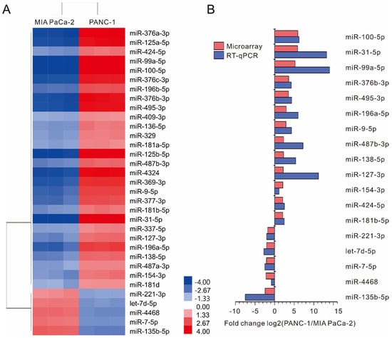 miRNA expression profile in MIA PaCa-2 and PANC-1 cell lines. (A) Hierarchical clustering result of 33 differentially expressed miRNAs. Each column corresponds to a single microarray, whereas each row indicates the expression profile of a single gene. The cluster analysis shows a clear separation between the two groups of samples. Colored bars indicate the range of fold change. (B) Validation of miRNA microarray data was done for 18 differentially expressed miRNAs using real-time RT-PCR. Data represent the log2-transformed fold change of expression between two pancreas ductal adenocarcinoma cell lines. U6 was used as an internal miRNA control. The qPCR values were displayed in blue and the array results in red.