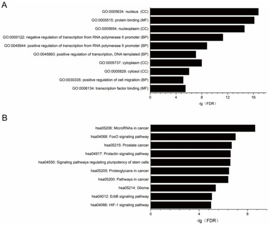 Enrichment analysis of GO function and pathways for predicted miRNAs targets significantly different expressed in PDAC cell lines. (A) GO function enrichment analysis. (B) KEGG pathway enrichment analysis. Only the top ten GO terms and pathways were shown in this figure. FDR < 0.05 was set as criteria for analysis.