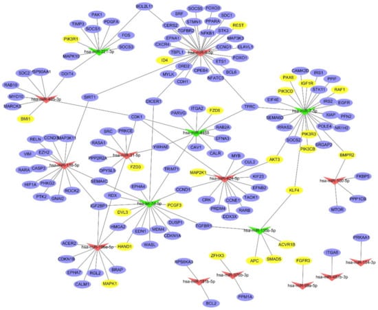 The regulatory network for differentially expressed miRNAs. The purple nodes represent the target genes. The yellow nodes represent those were enriched in the signaling pathways regulating the pluripotency of stem cells. The red triangles indicate the up-regulated miRNAs, while the green triangles indicate the down-regulated miRNAs. The lines show the potential regulatory relationships between the miRNAs and target genes.