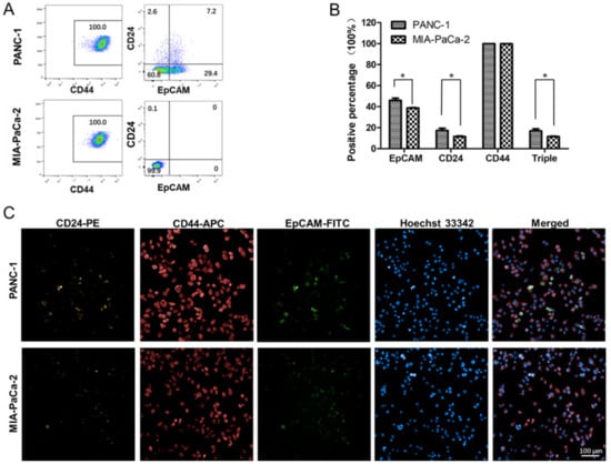 PANC-1 and MIA-PaCa-2 cells were cultured in DMEM supplemented with 10% FBS, which was then dissociated with trypsin solution. After dissociated into single cells, PANC-1 and MIA-PaCa-2 were washed with PBS and counted. Then cells were resuspended in incubation buffer (PBS supplied with 3% FBS) at the concentration of 1 × 107 cells/mL. APC-conjugated anti-human CD44 (311117, BioLegend, San Diego, CA, USA), Alexa Fluor 488-conjugated anti-human EpCAM (324209, BioLegend) and PE-conjugated anti-human CD24 (311105, BioLegend) were added according to the manufacturer’s instructions and incubated at 4 °C protected from light. After 30 min incubation, the cells were washed twice and analyzed on a flow cytometer (FACS Aria II, Becton Dickinson, San Jose, CA, USA).